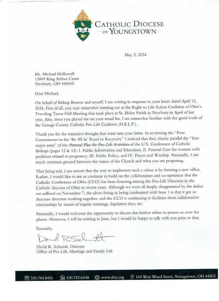 Letters to the Bishop Our MissionIssuesAbortionDeath PenaltyPro-Life Governmental AffairsPost AbortionBioethicsDisability ServicesEnd of Life IssuesArchiveResourcesWalking With Moms in NeedPregnancy Resource GuideSafe Haven Baby BoxPro-Life Training CourseCatholic Pro-Life ResourcesLetters to the BishopThe ChoiceUpcoming EventsContactDonate Letters On Behalf of HELP 2024-5-24 letter to bishops and CCO 2024-5-20 CCO response letter 2024-5-2 1975 Pastoral Plan for Pro-Life Activities WRITTEN BY USCCB 2024-5-2 LETTER FROM YOUNGSTOWN DIOCESE 2024-4-12 LETTER TO BISHOPS AND CCO ON OFFICE OF THE LITTLE ONE 2024-2-7 CCO handout to letter 2024-2-7 CCO response 2023-12-3 LETTER TO BISHOPS AND CCO MOVING FORWARD